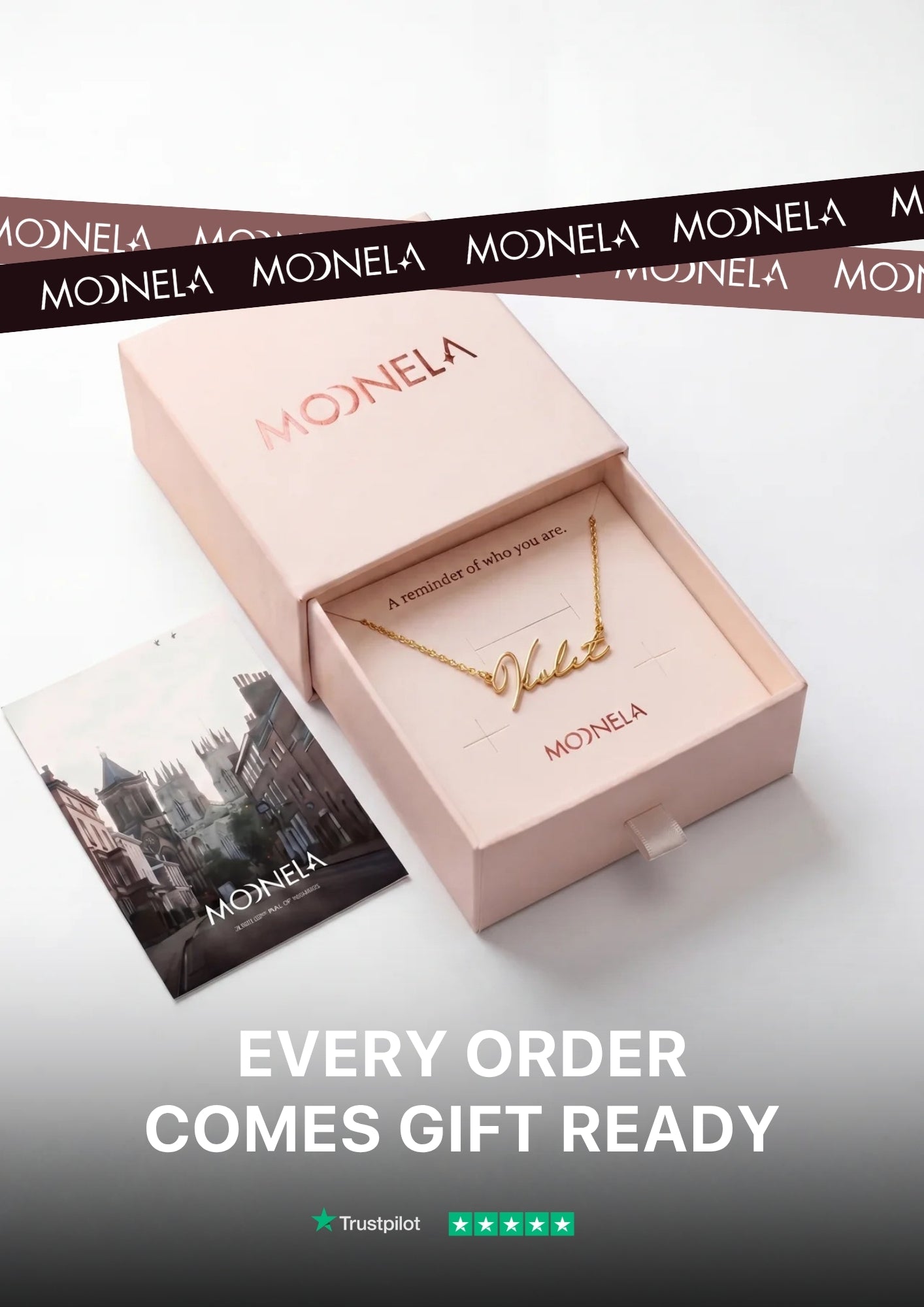 Most fashion gold necklaces use flash plating — a thin microscopic layer of gold that wears off within a year. Moonela vermeil is a heavier bonded layer of real 18K gold (minimum 2.5 microns, the US FTC standard) over solid sterling silver or stainless steel. That is why every piece in the collection is genuinely waterproof, why the gold does not peel, and why pieces carry a 2-year warranty. You can wear a Moonela gold necklace through shower, pool, sea, sweat and sleep. The colour holds, the chain holds, the clasp holds.