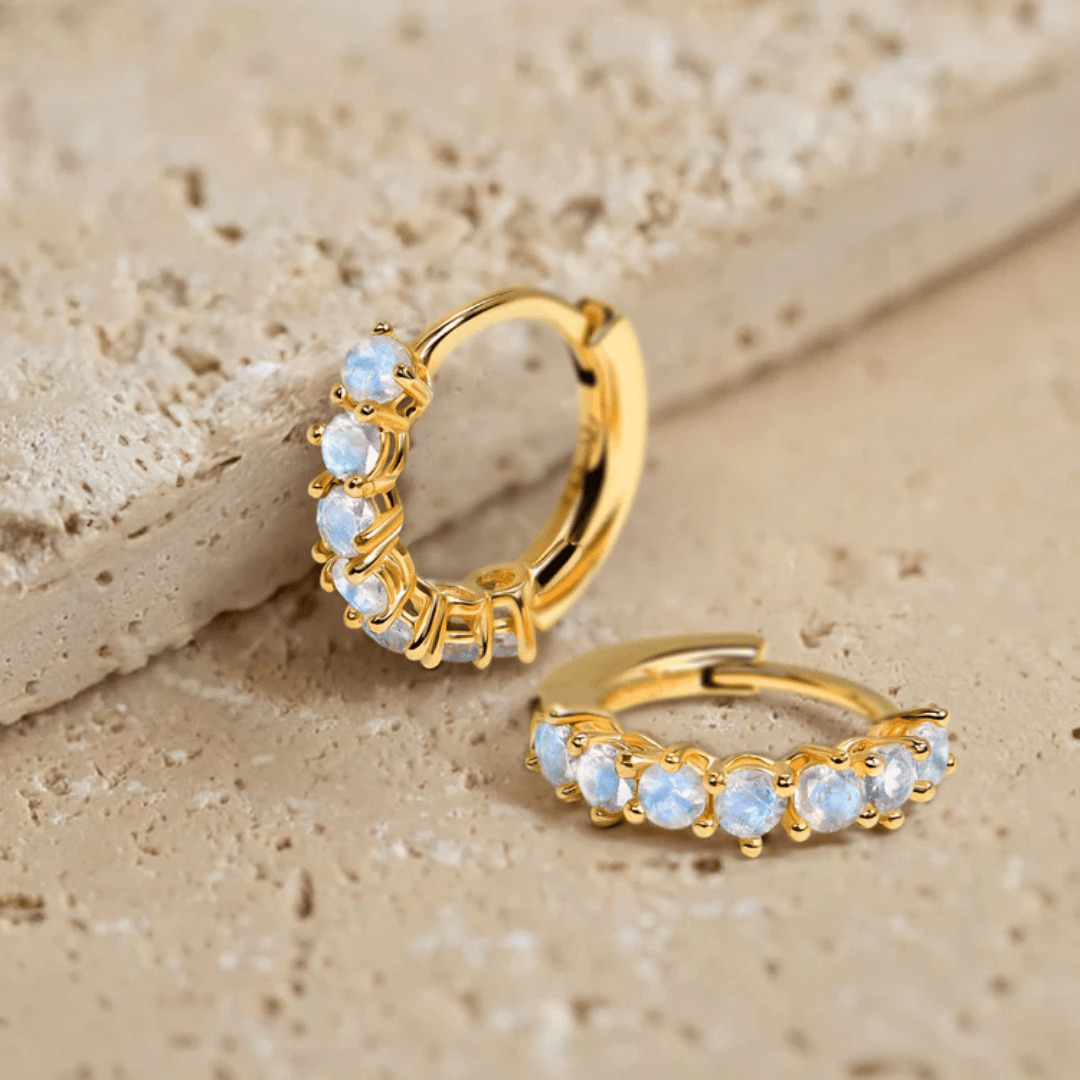 Dotati di 14 autentiche pietre di luna Moonela, questi eleganti orecchini a cerchio sono impreziositi da piccole pietre rotonde taglio brillante, ciascuna delle quali misura 2 mm x 2 mm. Gli orecchini a cerchio misurano 12 mm x 12 mm, creando un gioiello delicato ma scintillante.